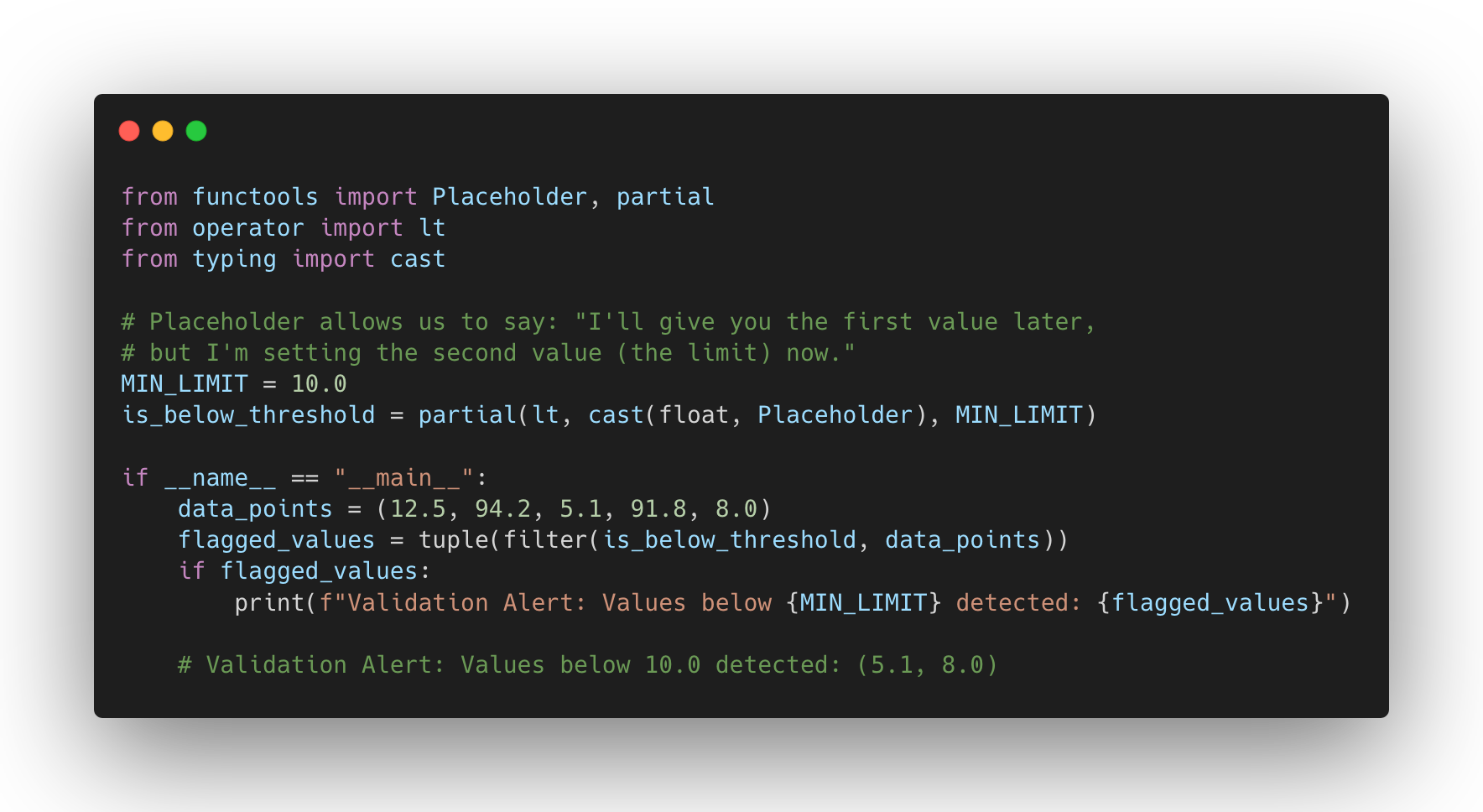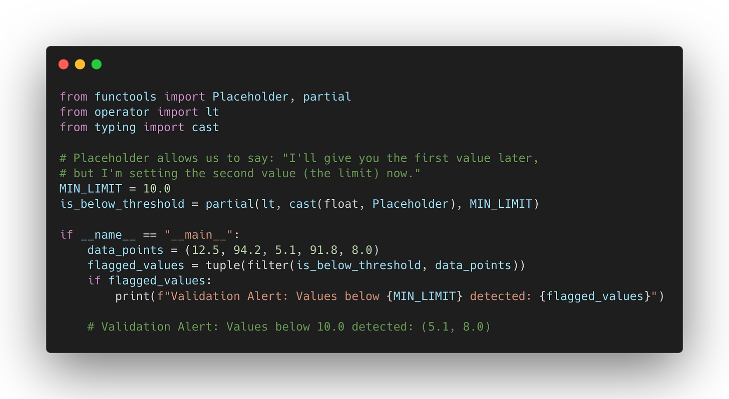 Still, you can treat FP paradigms as a pragmatic toolkit and apply them where they fit. In practice, that might mean using higher-order functions to specialize and compose behavior, enabling ad-hoc polymorphism through generic function dispatch, reaching for point-free transformations when they make code more ergonomic, etc. This article takes that approach and covers a few often overlooked FP techniques in Python.