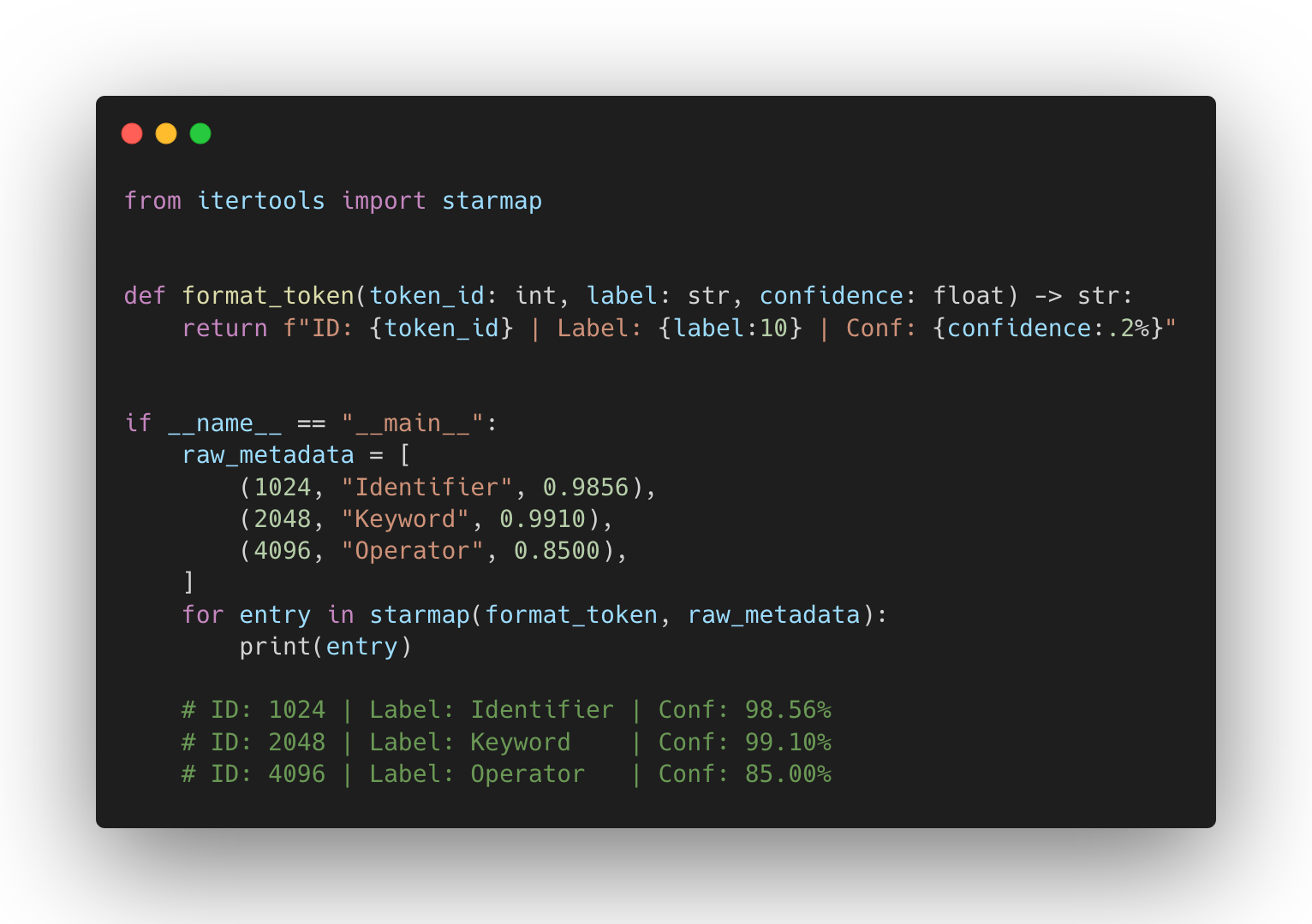 starmap provides arity alignment by automatically unpacking tuple elements into a function's positional parameters. It acts as a formal bridge for higher-order composition, allowing n-ary logic to consume product types directly. This offloads argument distribution to the iterator protocol, decoupling data structure from functional logic.