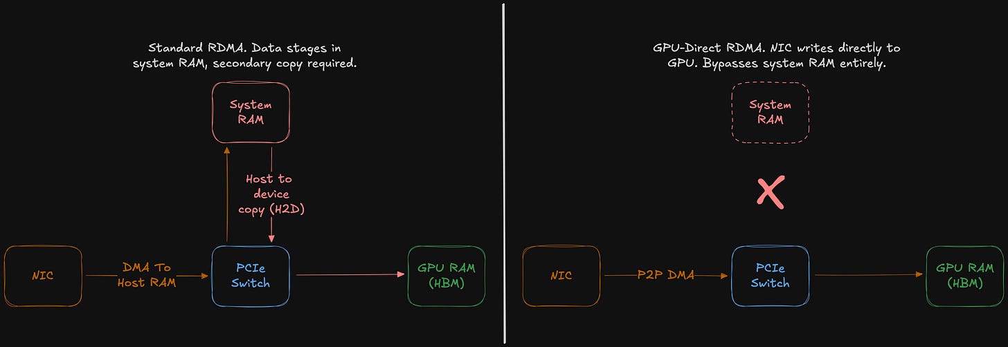 For GPU-heavy training, the remaining limitation of “standard” RDMA is that it first sends data to system RAM, which adds additional data staging and extra PCIe traffic when the real target is GPU memory. GPUDirect RDMA removes this inefficiency by allowing the NIC to DMA directly into GPU memory.