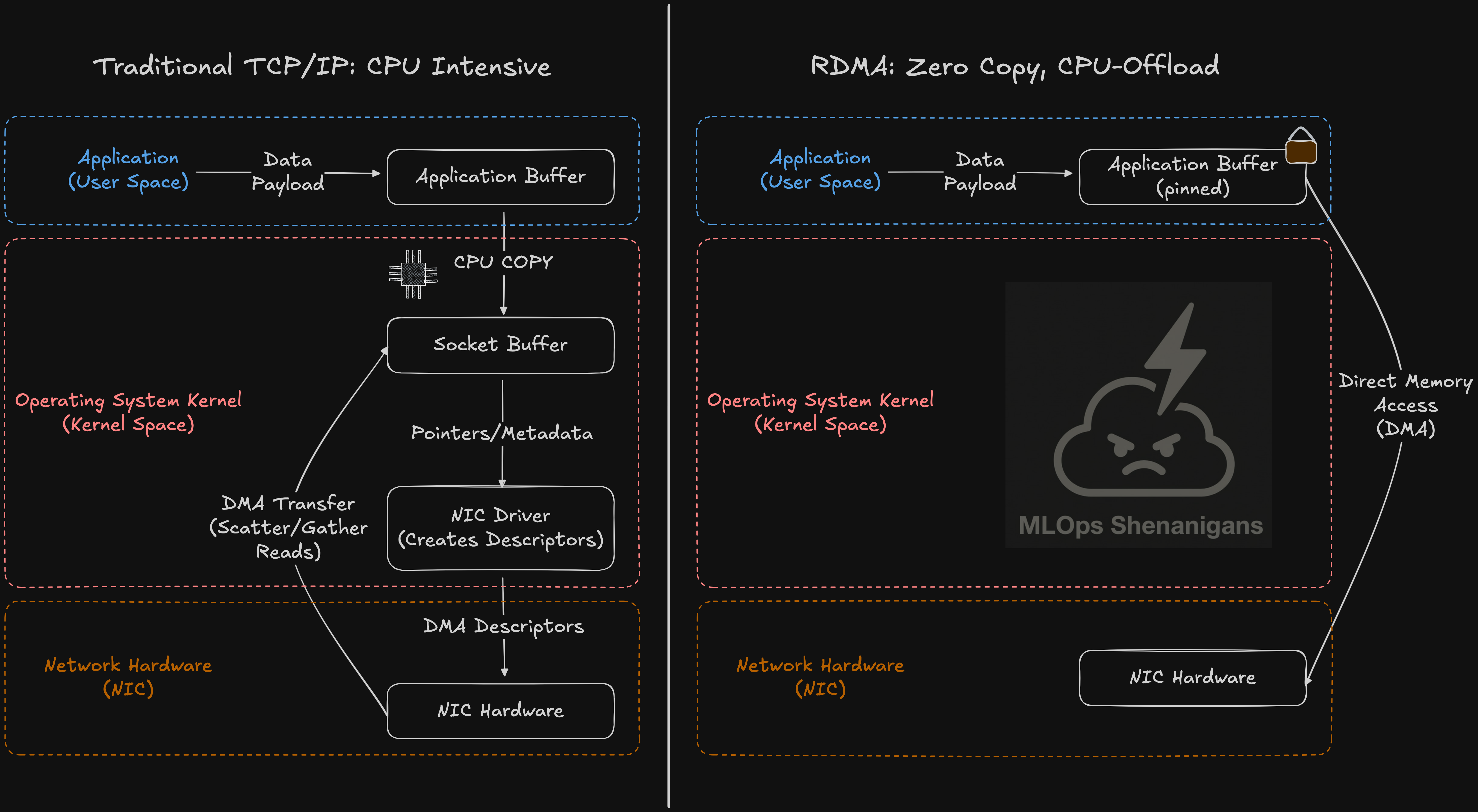 In a traditional TCP/IP stack, the host CPU manages the transport lifecycle, which adds overhead from kernel crossings, interrupts, and extra data copies. InfiniBand avoids much of this by pushing transport and data movement into the NIC using RDMA. Ethernet can get to a similar programming model with RDMA over Converged Ethernet, most commonly RoCEv2. In both cases, the idea is the same: applications post work to NIC-managed queues, memory is registered up front, and the NIC uses DMA to move bytes directly between those regions with minimal kernel involvement and fewer copies.